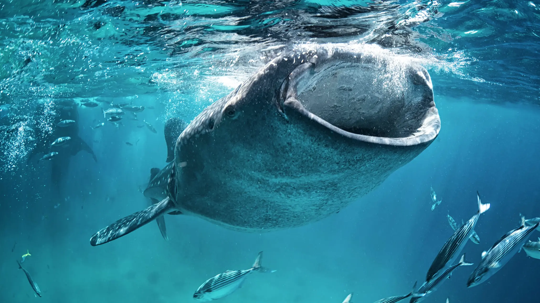 Despite their massive size, whale sharks are filter feeders that mainly feed on plankton, small fish, and squid. They have a unique feeding mechanism where they open their large mouths and filter water through their gills, trapping food particles in their comb-like structures.