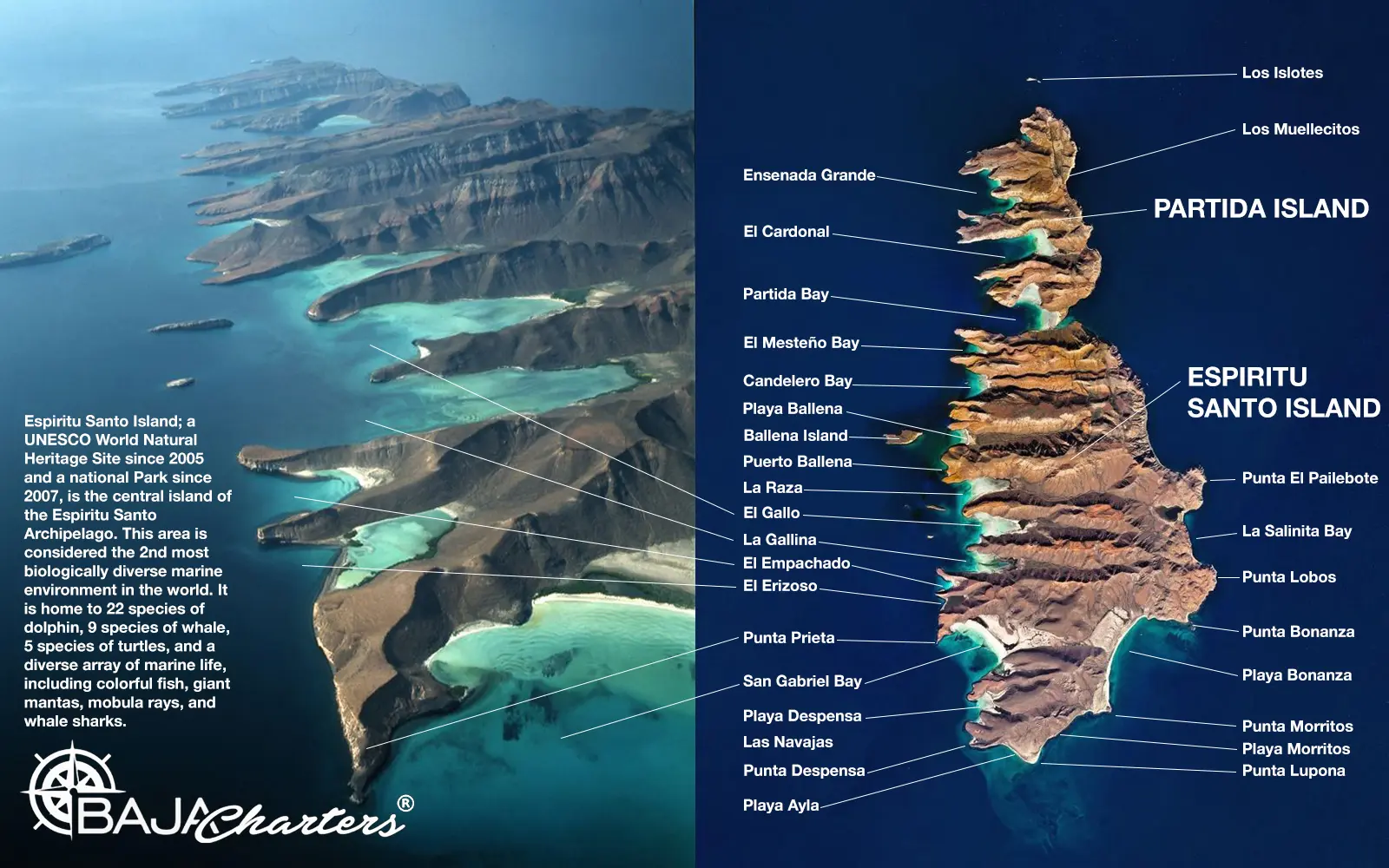 Espiritu Santo Island has been a UNESCO World Natural Heritage Site since 2005 and a national park since 2007. It is the central island of the Espiritu Santo Archipelago. This area is considered to be the 2nd most biologically diverse marine environment in the world. It is home to 22 species of dolphin, 9 species of whale, 5 species of turtles, and a diverse array of marine life, including colorful fish, giant mantas, mobula rays, and whale sharks.